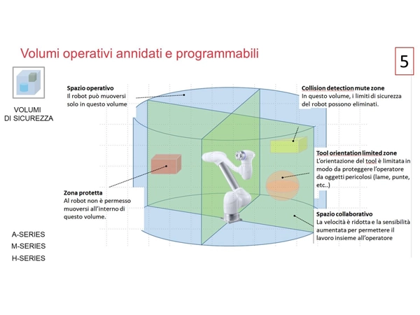 Doosan con i volumi di sicurezza integrati porta il cobot a un livello superiore offrendo fino a 20 zone di sicurezza in varie forme (sferiche, cilindriche, parallelepipede rettangolari, ecc.). I volumi sono annidati e programmabili e secondo le esigenze possono essere attivati o disattivati. Inoltre, il controllore del cobot monitorerà il movimento dell’intero braccio, non solo del gomito e del punto centrale dell’utensile (TCP). È possibile impostare valori limite personalizzati o fermate di sicurezza in ciascuna dei volumi. Ciò garantisce che l’intero braccio si comporti come si desidera all’interno di ogni zona.