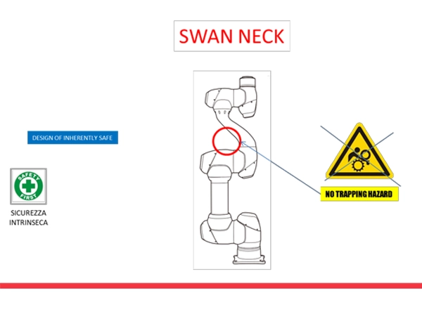 Anche il design del polso del cobot Doosan ha lo scopo di mantenere la sicurezza al primo posto. Il caratteristico “collo di cigno” è stato specificamente progettato per prevenire i punti di intrappolamento/cesoiamento, mantenendo gli operatori sempre al sicuro.