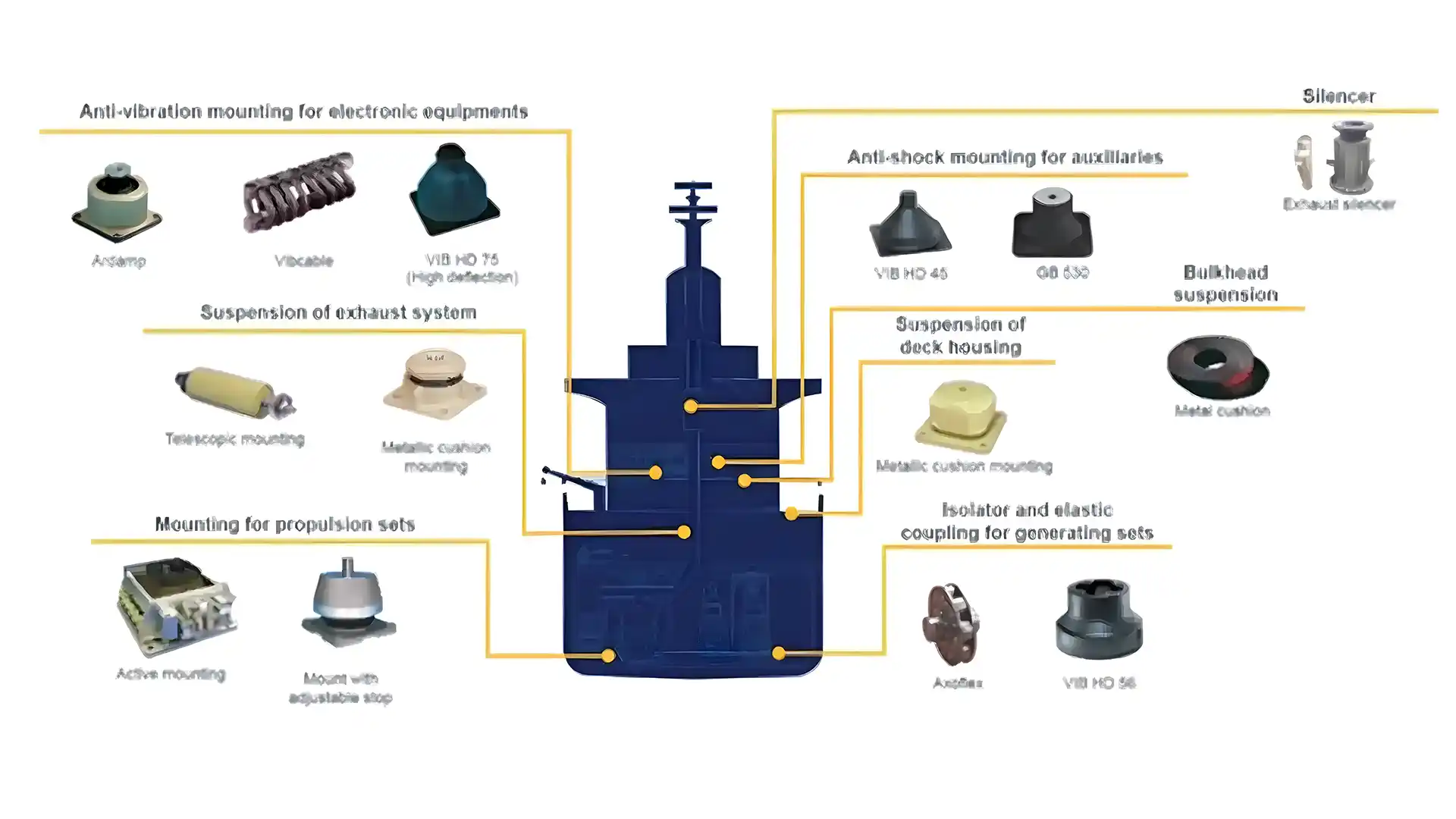 Le navi, costruite principalmente in metallo, sono particolarmente vulnerabili alla trasmissione di vibrazioni. Per questo, è necessario isolare i sistemi che generano queste vibrazioni attraverso l’uso di antivibranti che possano assorbire l’energia e ridurre i movimenti indesiderati. Questi dispositivi devono essere progettati per resistere alle sollecitazioni dinamiche causate dal moto nave, come beccheggio e rollio, garantendo stabilità e protezione anche in condizioni operative difficili.