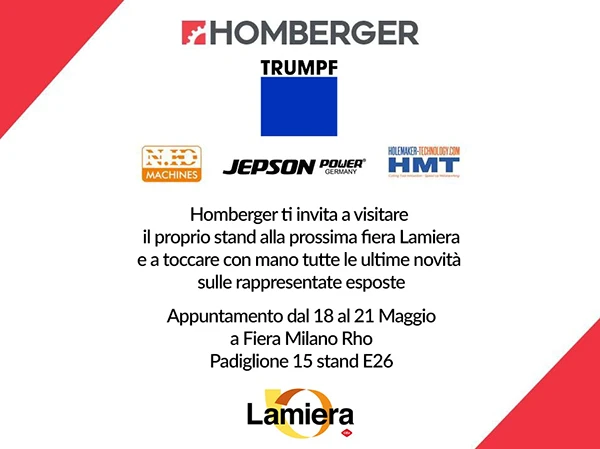Siamo lieti di invitarla alla prossima Fiera Lamiera 2022 che si terrà il prossimo 18/19/20/21 Maggio presso Fieramilano Rho. Homberger avrà a disposizione uno stand di 120 mq situato nel Padiglione 15 stand E26 dove avremo avere il piacere di accoglierla e presentarle tutte le novità delle case rappresentate.